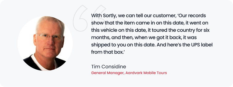 “With Sortly, we can tell our customer, ‘Our records show that the item came in on this date, it went on this vehicle on this date, it toured the country for six months, and then, when we got it back, it was shipped to you on this date. And here’s the UPS label from that box.’”