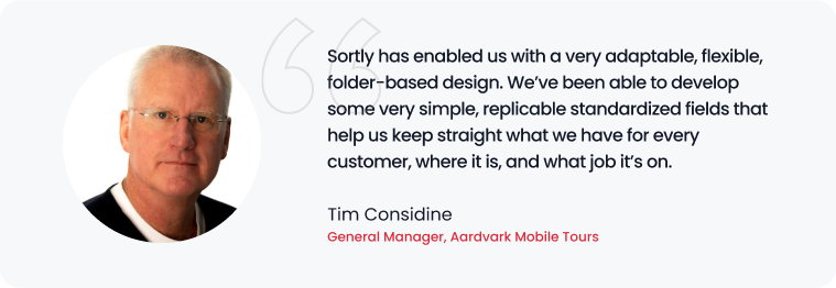 “Sortly has enabled us with a very adaptable, flexible, folder-based design. We’ve been able to develop some very simple, replicable standardized fields that help us keep straight what we have for every customer, where it is, and what job it’s on.”